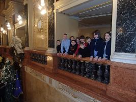 Потім ми пішли в Оперний театр на балет "Лускунчик". В театрі було, як в палаці: фойє з мармуру. Особливо нас вразила Дзеркальна зала. Наші місця були під самим куполом Оперного театру. Балет "Лускунчик" був цікавим і захоплюючим, гарні артисти, мініатюрні балерини, красиві костюми. Дівчатам особливо сподобались плаття.